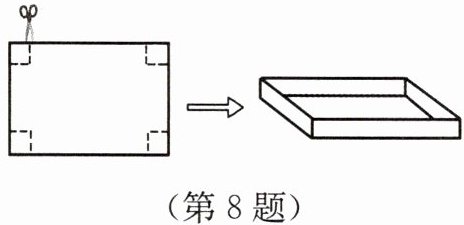 8. 如图,把一张长 $ 10\mathrm{cm} $、宽 $ 8\mathrm{cm} $ 的矩形硬纸板的四周各剪去一个小正方形,然后折叠成一个无盖的长方体盒子(纸板厚度忽略不计). 盒子底面积 $ S(\mathrm{cm}^{2}) $ 与剪去的小正方形边长 $ x(\mathrm{cm}) $ 之间的函数表达式是