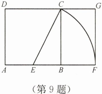 9. 摄影时,为了寻找拍摄画面中的黄金分割点,摄影师常大致构造一个黄金矩形:在正方形$ABCD$中,以$AB$的中点$E$为圆心,线段$EC$为半径画弧,交$AB$的延长线于点$F$,图中便出现了黄金矩形. 请指出图中的黄金分割点和黄金矩形,并加以说明.