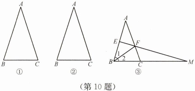 (2)在图③中,$BF$平分$\angle ABC$交$AC$于点$F$,取$AB$的中点$E$,连接$EF$并延长交$BC$的延长线于点$M$. 判断$CM$与$AB$之间的数量关系,并说明理由.
