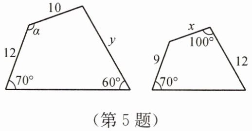 5. 如图,已知两个四边形相似,求 $x$、$y$ 及 $\angle \alpha$.