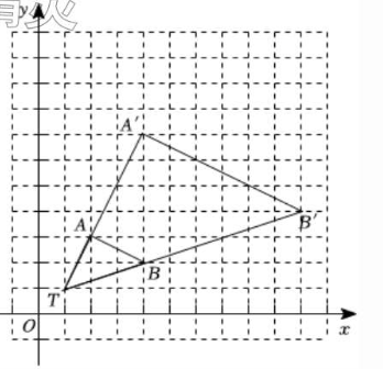 (1)以点 $ T $ 为位似中心,在正方形网格中,把 $ \triangle TAB $ 按 $ 3:1 $ 的比例放大为 $ \triangle TA'B' $,并写出点 $ A' $、$ B' $ 的坐标;