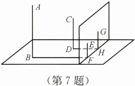 7. 如图,在一面与地面垂直的墙面的同侧有一根高 10 m 的旗杆 AB 和一根高度未知的电线杆 CD,它们都与地面垂直. 小丽进行如下测量:某一时刻,旗杆在墙面上的影长 EF 为 2 m,在地面上的影长 BF 为 10 m,电线杆在墙面上的影长 GH 为 3 m,在地面上的影长 DH 为 5 m. 求电线杆的高度.