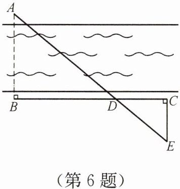 6. 如图,为了估算河的宽度,可以在河对岸选定一个目标作为点 A,在本岸选点 B 和 C,使 BC⊥AB,然后再选点 E,使 CE⊥BC,BC、AE 交于点 D. 如果此时测得 BD=120 m,DC=60 m,EC=50 m,求两岸间的距离 AB.