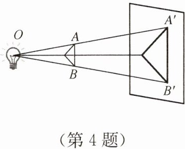 4. 三角形木板在灯泡 $ O $ 的照射下在墙上形成的影子如图所示. 若 $ OA = 40$ cm,$ AA' = 60$ cm,$ AB = 14$ cm,则 $ A'B' $ 的长度为(