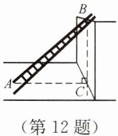 12. 如图,一架梯子斜靠在墙上,若梯子底端到墙的距离$AC = 3\ \mathrm{m}$,梯子与水平地面的夹角$\angle BAC$的余弦值为$\frac{3}{4}$,则梯子$AB$的长为(