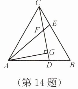 14. 如图,在等边三角形 $ABC$ 中,点 $D$、$E$ 分别在边 $AB$、$BC$ 上,$AD=BE$,$AE$ 与 $CD$ 相交于点 $F$,$AG⊥ CD$,垂足为 $G$. 求 $\frac{AG}{AF}$ 的值.
