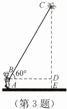 3. 小明站在$A$处放风筝,风筝飞到$C$处. 如果此时风筝线正好是直线,且线长$BC = 20\mathrm{m}$,$\angle CBD = 60^{\circ}$,牵引底端$B$离地面$1.5\mathrm{m}$,那么此时风筝距地面的高度约为
