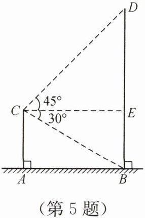5. 如图,两栋建筑物$AC$、$BD$之间的距离$AB = 24\mathrm{m}$,$CE$是水平线,在$C$处测得$\angle BCE$、$\angle DCE$分别为$30^{\circ}$和$45^{\circ}$. 求这两栋建筑物的高.