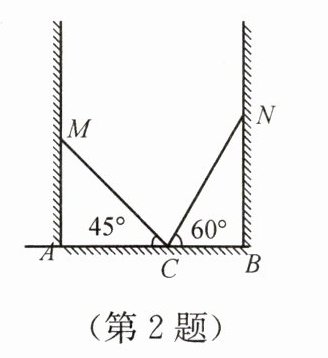 2. 如图,房间内有一个梯子斜靠在墙上,梯子顶端距地面的垂直距离$MA = 2\mathrm{m}$,此时,梯子的倾斜角为$45^{\circ}$,如果梯子底端不动,顶端靠到对面墙上的点$N$处,这时梯子的倾斜角为$60^{\circ}$,则该房间的宽$AB$约为