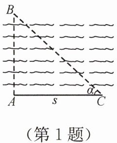 1. 如图,小明为了测量其所在位置点 $ A $ 到河对岸点 $ B $ 之间的距离,沿着与 $ AB $ 垂直的方向行走了 $ s $ m,到达点 $ C $,测得 $ \angle ACB = \alpha $,则 $ AB $ 的长度为(