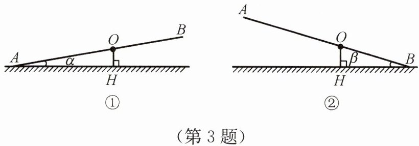 3. 已知不等臂跷跷板 $ AB $ 长 $ 4 $ m. 如图①,当 $ AB $ 的一端 $ A $ 碰到地面时,$ AB $ 与地面的夹角为 $ \alpha $;如图②,当 $ AB $ 的另一端 $ B $ 碰到地面时,$ AB $ 与地面的夹角为 $ \beta $. 求跷跷板 $ AB $ 的支撑点 $ O $ 到地面的高度 $ OH $(用含 $ \alpha $、$ \beta $ 的式子表示).