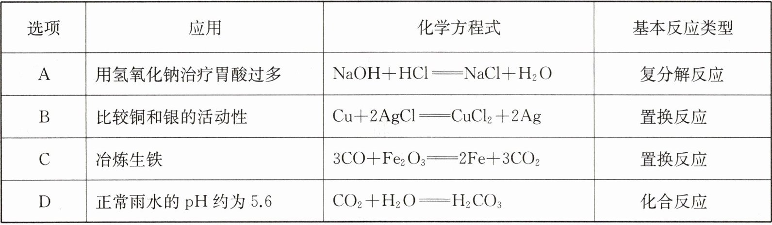 3. 下表中的应用、对应的化学方程式和所属基本反应类型都正确的是(