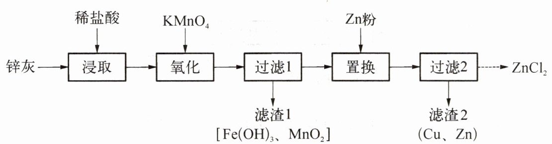 4. (2025 南通中考)以锌灰(主要成分为 ZnO,含少量 FeO、MnO、CuO)为原料制备 ZnCl₂的工艺流程如下(“→”表示部分过程略去),请回答下列问题。
