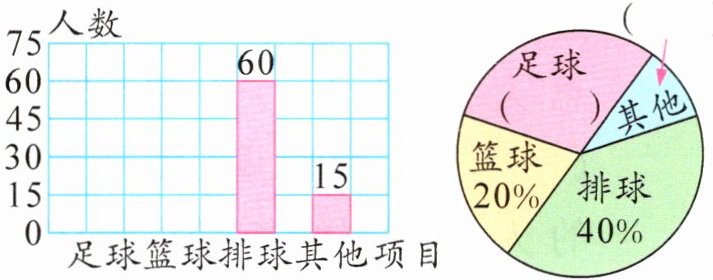 解析:由条形统计图可知,爱好排球运动的有60人,由扇形统计图可知,爱好排球运动的人数占总人数的40%,则抽样调查了60÷40% = 150(人)。爱好其他球类运动的人数占总人数的15÷150 = 10%,爱好足球运动的人数占总人数的1 - 10% - 40% - 20% = 30%,再根据总人数和百分比,求出爱好足球、篮球运动的人数,补全统计图。