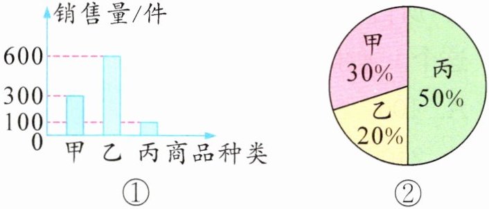 6. 星辰商场甲、乙、丙三种商品的销售量情况如图①,对应的利润分布情况如图②。这三种商品中,单件商品的最高利润是最低利润的(