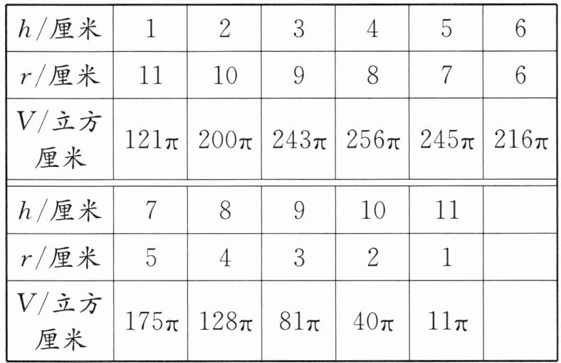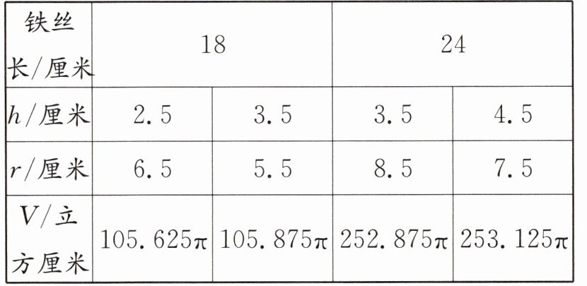 答案:可以取与最大值接近的,比如铁丝长18厘米,圆柱的底面半径和高分别取6.5厘米和2.5厘米、5.5厘米和3.5厘米;若铁丝长24厘米,圆柱的底面半径和高分别取8.5厘米和3.5厘米、7.5厘米和4.5厘米。(取值不唯一)