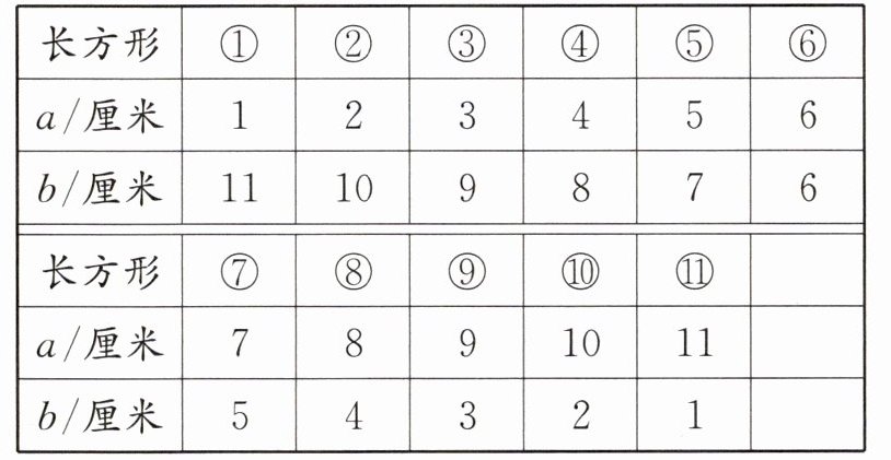 相邻边a、b的长度之和是24÷2=12(厘米)。a、b长度列表如下: