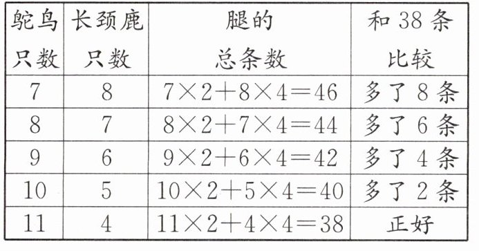 1. 动物园里鸵鸟和长颈鹿共有15只,它们共有38条腿。鸵鸟和长颈鹿各有多少只?