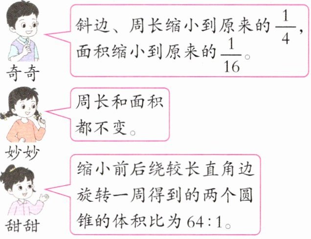 答案:7. 奇奇和甜甜说的是对的,妙妙说的是错的。理由如下:一个直角三角形的直角边按1:4的比缩小后,斜边和周长都缩小到原来的$\frac{1}{4}$,根据三角形面积计算公式“$S=ah ÷ 2$”可知,面积缩小到原来的$\frac{1}{16}$。假定缩小前的两条直角边分别为8、4。缩小前的体积:$4^2 \pi×8×\frac{1}{3}= \frac{128\pi}{3}$,缩小后的体积:$1^2 \pi×2×\frac{1}{3}=\frac{2\pi}{3}$,$\frac{128\pi}{3}:\frac{2\pi}{3}=64:1$。