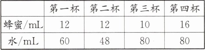 4. (南通通州区期末)丽丽用水和蜂蜜为家人调制了四杯蜂蜜水,蜂蜜与水的配比情况如下表。