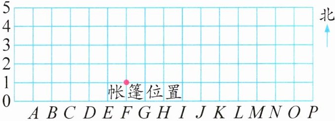 答案:1.(1) 5 4 3 2 1 0 A B C D E F G H I J K L M N O P 纵轴0到5,横轴A到P,H正下方为帐篷位置,A位于H正上方第4个格点位置,B位于L正上方第4个格点位置,A和B在同一水平线,连接A和帐篷位置所在点,向上为北方。