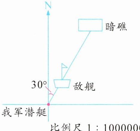 应用意识 一天,在如图的海域中,敌舰在距我军潜艇的图上距离 $1$ 厘米处,并沿我军潜艇北偏东 $30^{\circ}$ 的方向以 $60$ 千米/时的速度逃跑,但正前方有暗礁(暗礁距我军潜艇的图上距离为 $3$ 厘米)。我军潜艇沿什么方向,以怎样的速度追击,能追上敌舰,且没有触礁危险?