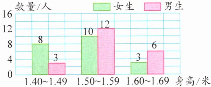 女生身高段人数:1.40~1.49米8人,1.50~1.59米10人,1.60~1.69米3人。