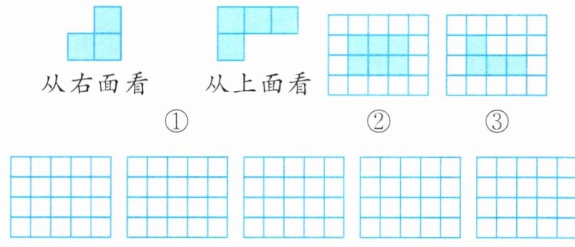 5. 用若干个小正方体搭建一个立体图形,假如从立体图形的右面和上面看到的形状如图①,但从该立体图形的正前方看,可能出现的情况不止一种,例如可能是图②、③的形状。请你仿照②、③的画法在所给的网格图中画出你认为可能的其他 5 种不同结果。