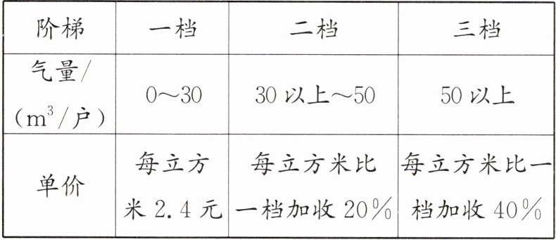 答案:10.一档:$30 × 2.4 = 72$(元) 二档:$2.4 × (1 + 20\%) × (50 - 30) = 57.6$(元) $57.6 + 72 = 129.6$(元) $129.6 > 115.2$ 没有第三档的加收。