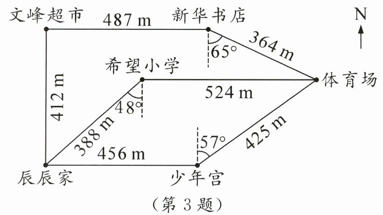 3. 如图是辰辰家附近的部分街道的示意图,根据图示填空。