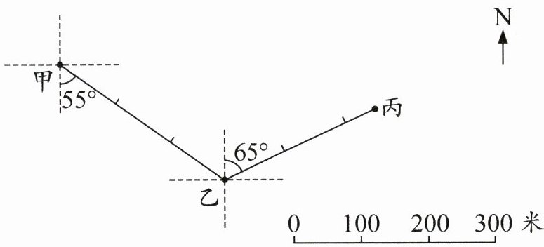 答案:1. 鸵鸟先从甲处向南偏东55°方向行走300米到乙处,再向北偏东65°方向行走250米到丙处。