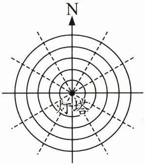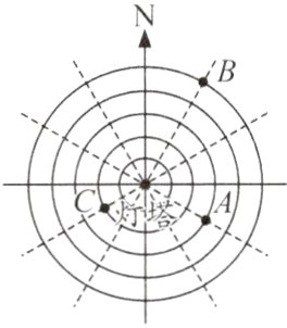 2. 如图是一个灯塔的雷达屏幕,每相邻两个圆之间的距离表示 10 千米,最小的圆的半径也是 10 千米。请你在图中表示出轮船 A、轮船 B 和轮船 C 的位置。