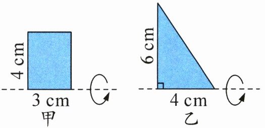 甲:以3cm边为轴旋转,形成底面半径4cm,高3cm的圆柱,体积$V_甲=\pi×4^2×3=48\pi\,\mathrm{cm}^3$;以4cm边为轴旋转,形成底面半径3cm,高4cm的圆柱,体积$V_甲=\pi×3^2×4=36\pi\,\mathrm{cm}^3$。