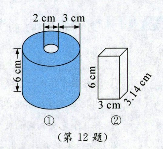 12. 亮点原创 图①是一个中间空心的圆柱形容器(容器底面是一个圆环),将容器①装满水后,再将①中的部分水倒入图②中的长方体容器中,使得两个容器内的液面高度相同,则现在水深(