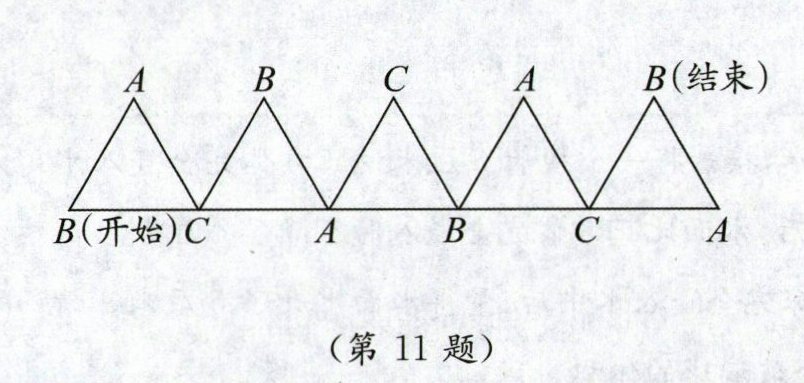 11. 有一个边长为4厘米的等边三角形ABC,现将它按如图的方式滚动,点B从开始到结束经过的路线的总长是(