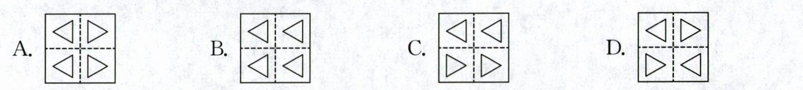 2. 新情境 折纸 如图,把一张正方形纸片沿着虚线连续对折两次后得到一个小正方形,再在小正方形中挖去一个三角形小孔,重新展开后得到的图形是(