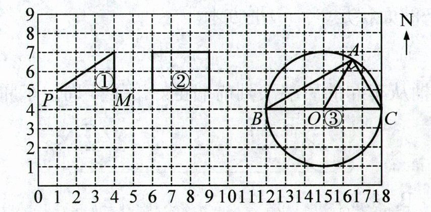 1. 画出图①绕点M逆时针旋转90°后的图形,旋转后点P的位置用数对表示为( , )。
