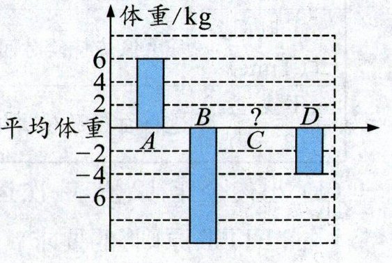 9. (2025·南通崇川区期末)如图,以 $ A、B、C、D $ 四人的平均体重为基准,已用条形统计图表示出 $ A、B、D $ 三人的体重(整千克数)。