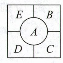 推理意识 如图,一个花坛被分成了五块,现有红、黄、蓝、紫、白五种颜色的花,要求每块只栽一种颜色的花,而且相邻两块的颜色必须不同。已知 $ A $ 里面栽的是白花,其余四块的不同栽法共有(