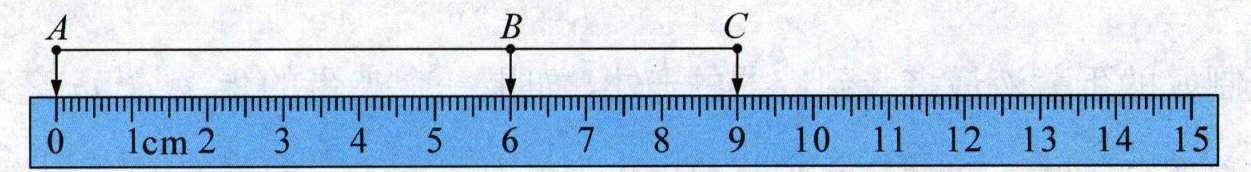 11. 明明沿着直尺的方向将橡皮筋拉直(如下图)。如果点 A 的位置固定不变,沿原来的方向将橡皮筋拉长,使点 C 的位置在 15 厘米处,那么此时点 B 的位置在(