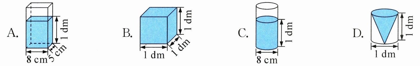 答案:6. D 解析 A容器中水的体积是$0.8×0.5×1=0.4(dm^3)$,B容器中水的体积是$1×1×1=1(dm^3)$,C容器中水的体积是$3.14×(0.8÷2)^2×1=0.5024(dm^3)$,D容器中水的体积是$\frac{1}{3}×3.14×(1÷2)^2×1≈0.26(dm^3)$。 因为$1>0.5024>0.4>0.26$,且糖的克数相同,所以最甜的是D。