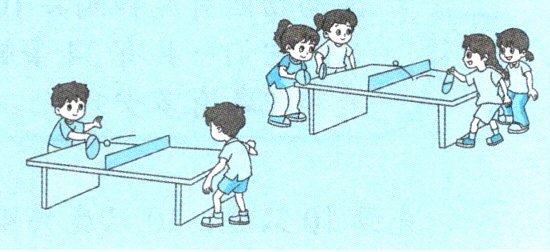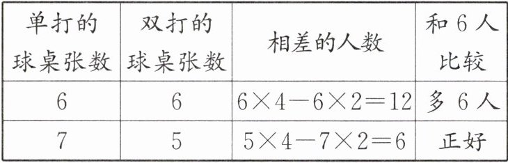 答案:单打比赛是双方各出 1 人,一张乒乓球桌上有 2 人比赛;双打比赛是双方各出 2 人,一张乒乓球桌上有 4 人比赛。可以先通过列表假设正在进行单打比赛、双打比赛的球桌各占一半,再通过调整找出答案,列表如下: