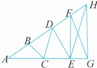 三角形$ABC$、三角形$BCD$、三角形$CDE$、三角形$DEF$与三角形$EFG$的面积之和,即19+21+23+25+28=116(平方厘米),三角形$AFG$和三角形$FGH$的高相等,所以$AF:FH=S_{三角形AFG}:S_{三角形FGH}=116:29=4:1$,三角形$AFE$和三角形$EFH$的高相等,所以$S_{三角形AFE}:S_{三角形EFH}=AF:FH=4:1$,又因为三角形$AFE$的面积是19+21+23+25=88(平方厘米),所以三角形$EFH$的面积是$88×\frac{1}{4}=22$(平方厘米)。