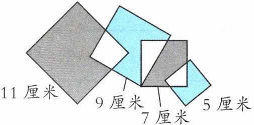 如图,4个互相重叠的正方形,边长分别是5厘米、7厘米、9厘米、11厘米,则灰色区域和蓝色区域的面积差是多少平方厘米?