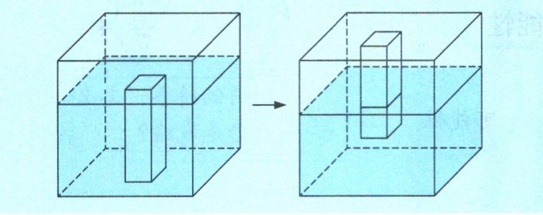 例 如图,一个棱长为 25 厘米的正方体密闭容器内装有一些水,在容器的底部粘着一个底面积为 125 平方厘米的长方体实心铁块,容器内水面高度恰好与铁块的上表面持平。将容器倒置过来后,发现仍有一部分铁块淹没在水面以下,此时水面的高度为 15 厘米。那么,这个长方体实心铁块的高度是多少厘米?