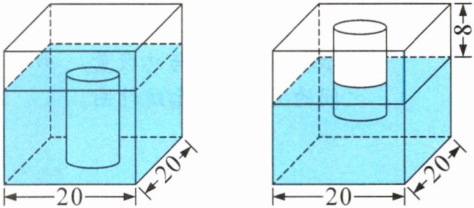 + 跟踪练习 如图,在一个棱长为 20 厘米的正方体密闭容器的下底面固定了一个实心圆柱,容器内盛有 $ m $ 升水时,水面恰好与圆柱的上底面平齐,如果将容器倒置,那么圆柱有 8 厘米露出水面。已知圆柱的底面积是正方体底面积的 $ \frac{1}{8} $,则实心圆柱的体积是(