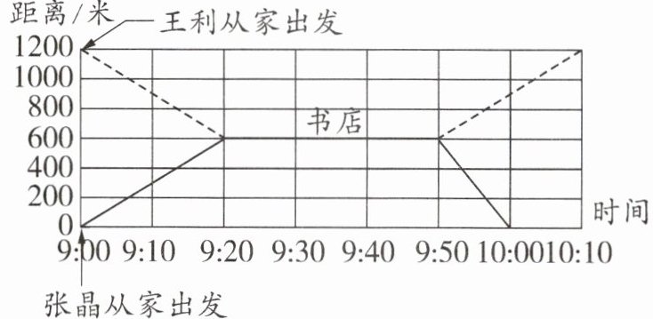 跟踪练习 下面是王利和张晶两人去同一家书店买书的折线统计图。他们分别住在一条马路的两端,相距 1200 米,书店恰好在两家的中间,根据统计图回答问题。