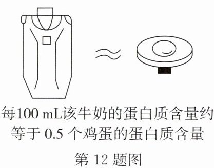 12. (2025·秦淮区期末)如图是某牛奶的“营养成分表”及相关说明. (注:NRV%表示 100 mL 牛奶中相关营养的含量占一个人每日所需该种营养总量的百分比的参考值)