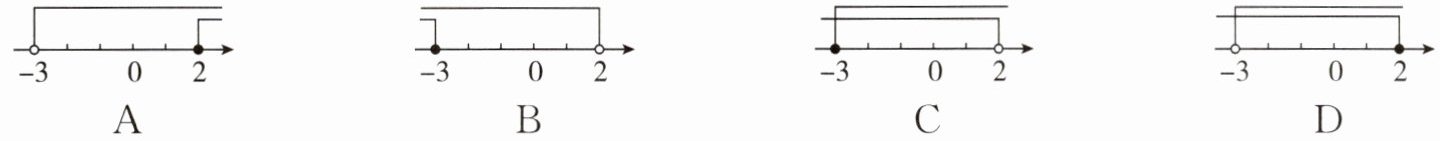 在数轴上表示为:起点$-3$处为实心点,向右画线,终点$2$处为空心点,向左画线,覆盖$-3$到$2$之间的部分。