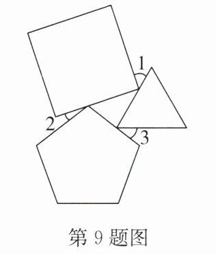 9. (2024·梁溪区期末)把正三角形、正四边形、正五边形按如图所示的位置摆放,若∠1 = 52°,∠2 = 18°,则∠3 =